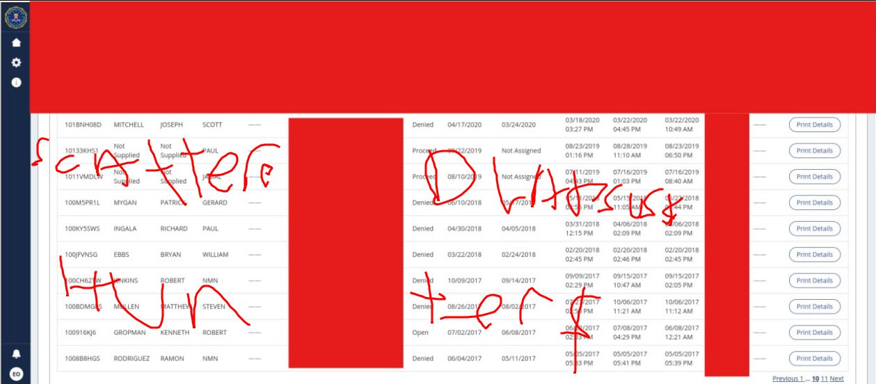 Screenshots appear to be taken from within the federal instant background check portal. Additional redaction on one screenshot by DataBreaches.net.